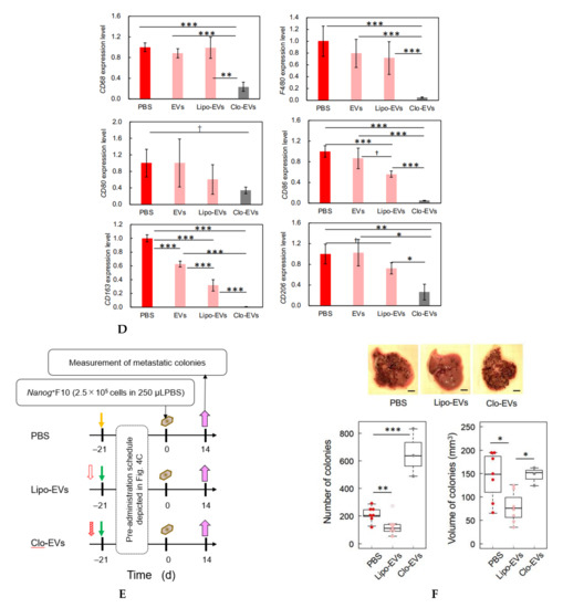 Involvement of macrophages in metastasis suppression by Nanog+F10-EVs. (A) Expression of CD68 in liver tissue slices and its depletion by clodronate treatment. PBS, treated with PBS; Clodronate, treated with clodronate at 12.5 mg/kg mouse body weight; Scale bar, 50 μm. (B) Histochemical images of liver tissue sections obtained by HE staining. PBS and Clodronate, same treatment as Figure 4A. CV, central vein; Scale bar, 50 μm.(C) Schedule for the pre-administration of Nanog+F10-EVs with or without clodronate. PBS, control; EVs, Nanog+F10-EVs; Lipo-EVs, Nanog+F10-EVs with liposomes containing no clodronate; Clo-EVs, Nanog+F10-EVs with liposomes containing clodronate. Orange arrow, injection of 100 μL PBS as a control; green arrow, injection of 100 μL PBS containing 5 μg Nanog+F10-EVs; unfilled red arrow, injection of PBS (in the range of 150–200 μL) containing liposome (62 mg/kg mouse weight) used as a carrier of clodronate; diagonally hatched red arrow, injection of PBS (in the range of 150–200 μL) containing liposome (l62 mg/kg mouse weight) and clodronate (12.5 mg/kg mouse weight); blue arrow, removal of livers. (D) Expression of macrophage markers in livers removed on 0 d and analyzed by quantitative RT-PCR. mean ± SD for n = 3, n = 2 (CD80 expression for Clo-EVs group). Refer to the legend for Figure 4C about PBS, EVs, Lipo-EVs, and Clo-EVs. (E) Schedule for the pre-administration and metastasis experiment. Refer to the legend for Figure 4C about PBS, Lipo-EVs, and Clo-EVs. Brown mark, injection of 250 μL PBS containing 2.5 × 105 cells of Nanog+F10; violet arrow, removal of livers. (F) Effects of clodronate on the metastasis suppression brought about by Nanog+F10-EVs. Refer to Figure 4E about the schedule of the experiment. Refer to the legend for Figure 4C about PBS, Lipo-EVs, and Clo-EVs. n = 7 (PBS, Lipo-EVs), n = 3 (Clo-EVs). ***: p < 0.001, **: p < 0.01, *: p < 0.05, †: p < 0.1.