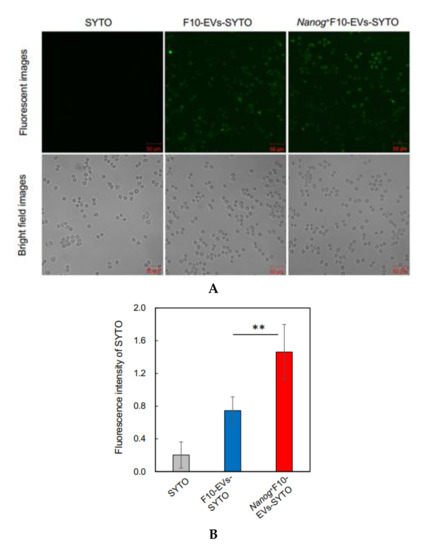F10-EVs and Nanog+F10-EVs labelled with SYTO, respectively, could be taken up into J774.1 cells (Figure 5A). This result was not due to the non-specific diffusion of SYTO, as free SYTO without EVs was not taken up (Figure 5A SYTO). The analysis of fluorescent images revealed that the uptake of Nanog+F10-EVs-SYTO was higher than that of F10-EVs-SYTO (Figure 5B).