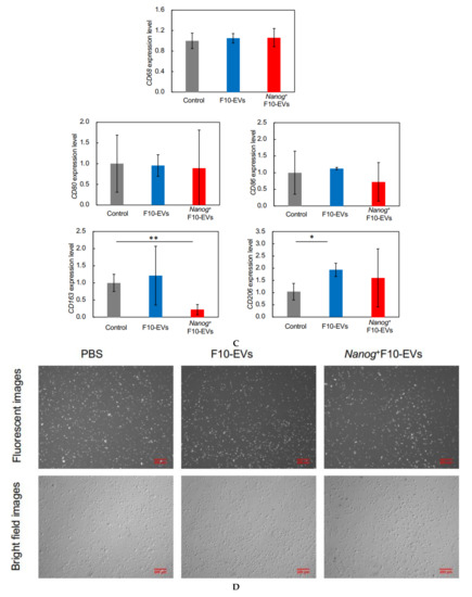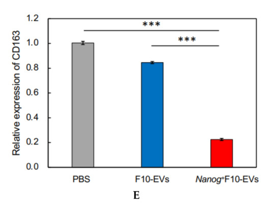 The expression of macrophage markers in J774.1 cells was analyzed by quantitative RT-PCR. The largest change (decrease) was observed in CD163 (Figure 5C). Then, the decrease in the CD163 protein was analyzed by fluorescent immunostaining. The cells were reacted with F10-EVs, Nanog+F10-EVs, or PBS (control). The fluorescent intensities of fluorescent cells were not homogeneous (Figure 5D). The fluorescent intensity and the cell size were analyzed for every fluorescent cell and integrated to determine the fluorescent intensity per unit area. The treatment with Nanog+F10-EV caused a marked decrease in the fluorescent intensity, indicating the decrease in CD163 (Figure 5E).