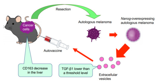 This study has demonstrated for the first time that EVs derived from cancer cells with high metastatic potential is an autovaccine candidate based on the concept depicted in Figure 6. An important key factor was Nanog overexpression that down-regulated TGF-β1. The decrease in TGF-β1 was observed in Nanog+F10 cells as compared to that in F10 cells. The decrease in TGF-β1 was also observed in EVs derived therefrom. The effects of EVs on the metastasis, however, were exactly opposite for F10-EVs and Nanog+F10-EVs. The metastasis-suppressive effect obtained with Nanog+F10-EVs was a surprising finding. Since the concentration-dependent opposite effects were observed, it seemed to be a dual role of TGF-β1.