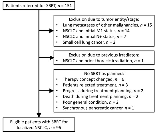We identified patients who were referred for SBRT to our institution. In total, 151 patients were assessed for eligibility. Among these, 96 patients with SBRT for localized NSCLC (start of SBRT, December 2012 to January 2021) were included in the study for further analysis. A total of 39 patients were excluded due to tumor entity, tumor stage, or previous irradiation. In 16 patients, SBRT was not applied as planned. Please see Figure 1 for further details. The staging procedures and treatment procedures were conducted in accordance with the national and international guidelines [10,12,13,17]. The treatment decisions were based on the multidisciplinary tumor board of the regional Lung Cancer Centre. The study was conducted after ethical approval by the ethics committee of the University Medical Center Göttingen (number 3/10/20).