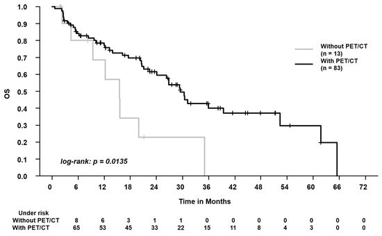 Overall survival (OS) in patients who were staged with positron emission tomography/computed tomography (with PET) vs. patients who were staged with conventional chest CT scan (without PET). The 2-year OS was 61.5% vs. 22.9%.