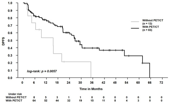 Distant progression-free survival (DPFS) in patients who were staged with positron emission tomography/computed tomography (with PET) vs. patients who were staged with conventional chest CT scan (without PET). The 2-year DPFS was 60.3% vs. 21.4%.