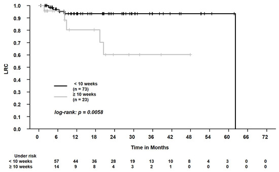 Locoregional control (LRC) in patients who were staged with positron emission tomography/computed tomography or chest CT scan < 10 weeks vs. ≥ 10 weeks before the start of SBRT. The 2-year LRC was 94.5% vs. 58.4%.