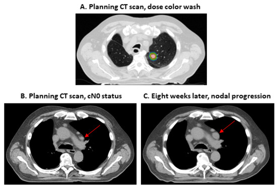 Clinical example of a patient without positron emission tomography/computed tomography staging and subsequent rapid regional progression. Male patient diagnosed with stage IA2 non-small cell lung cancer of the left upper lobe. The patient was staged with conventional imaging (computed tomography scan of the upper and lower body, cranial magnetic resonance imaging and bronchoscopy, image (B) shows the initial status). The patient was treated with 55 Gy in 5 fractions (prescribed to the 80% isodose; image (A) shows the dose from 55 Gy [blue] to 68.75 Gy [red]). A CT-scan 2 months later (image (C)) showed good response of the primary tumor, but revealed the progression of a mediastinal lymph node (growth from 1.5 cm × 0.9 cm to 2.3 × 1.5 cm, red arrows in images (B,C)).
