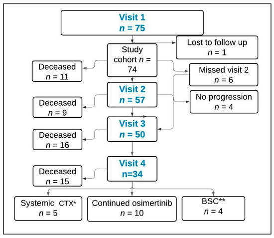 From January 2017 to January 2021, 75 pts were enrolled in the study. These include fifty-two patients that were receiving first-line TKI treatment (cohort 1) and twenty-three patients that were TKI naïve (cohort 2). The flowchart tracks the patient status over the four visits (Figure 1).
