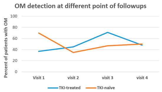 ctDNA detected the OM in 35/75 (48%) patients. Significantly higher (p = 0.012) detection rates were observed in TKI-naïve patients compared to the TKI-treated group, 70% versus 37%, respectively (Table 3 and Figure 2). The OM detection in the TKI treated group peaked at the time of progression (Figure 2).
