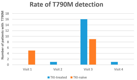 The resistance mutation (T790M) was detected in 32/74 (43%) patients. A de novo T790M was detected in five TKI-naïve patients: one only on ctDNA and four on both: ctDNA and diagnostic tissue sample. In 27/32 (84%) the T790M was detected during treatment with TKI: in 25/27 patients, T790M was detected at the time of radiologic progression; in one patient, T790M was detected before radiologic progression; and in one patient, T790M was detected four weeks after starting systemic chemotherapy post-progression on TKI (Figure 3). At the time of progression (visit 3), the re-appearance of OM significantly (p = 0.001) correlates with detection of T790M (Table 4).
