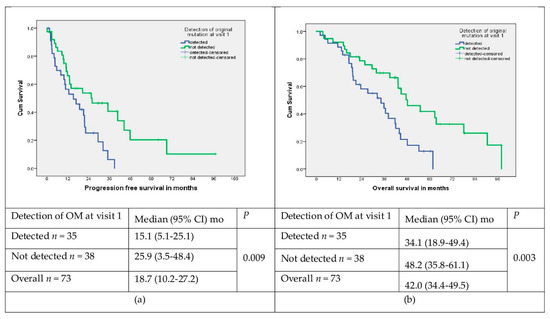 (a) PFS in patients with detected and not detected OM at visit 1; (b) overall survival in patients with detected vs. not detected OM at visit 1.