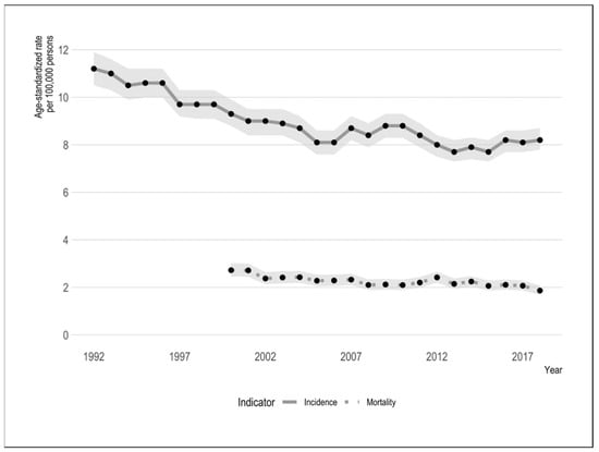 Cervical cancer incidence has steadily declined since the 1970s, with annual percentage changes (APC) ranging from −8.8% to −0.33% []. In 1984, the age-standardized incidence rate (ASIR) of cervical cancer was 13 per 100,000 and has declined to an estimated 7.1 per 100,000 persons in 2020 []. Nationally, ASIR trends reported for 1984–2015 showed an average annual percentage change (AAPC) of −1.8% (95% confidence intervals (CI) = −1.3 to −2.3) []. Despite a sharp decline in the trend early on, the downward trend has slowed in recent periods—Brenner et al. reported a decline from 9.0 per 100,000 persons in 2002 to 8.0 per 100,000 persons in 2016 []. Incidence trends have tended to fluctuate slightly over this period. These trends are illustrated in Figure 1.
