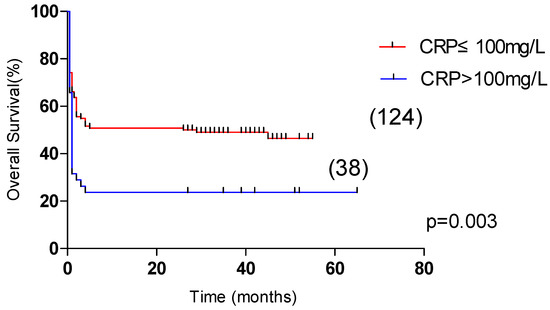 | CRP > 100 mg/L | 1.811 | 1.164–2.820 | 0.009 | 1.657 | 1.038–2.646 | 0.034 |
