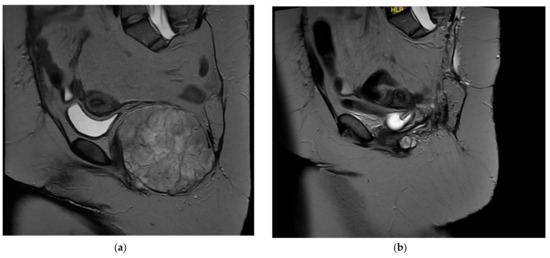 (a) Sagittal T2 MRI demonstrating a recurrent chordoma in the pelvic floor with evidence of prior sacrectomy. (b) Postsurgical sagittal T2 MRI demonstrating postsurgical changes after en bloc resection of chordoma requiring removal of the distal colon, rectum, and anus.