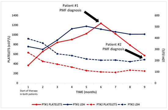 An 82-year-old male, diagnosed with CLL in 2013, was referred to our institution with progressive disease in 2017. The patient’s only complaint was generalized pruritus, with a maculo-papular rash deemed secondary to CLL. The full blood count showed lymphocytosis, with the presence of atypical lymphocytes on the blood smear (Hb 149 g/L, PLT 340 × 109/L, WBC 37 × 109/L, PMN 11 × 109/L, and lymphocytes 26 × 109/L). A flow cytometric analysis on the peripheral blood (PB) documented a B-cell clone expressing CD5, CD23, CD20 (dim), CD38 and CD200, consistent with CLL; cytogenetics and molecular studies documented chromosome 11q deletion, with an unmutated IGHV status, and wild-type NOTCH1 and TP53 genes. A whole-body CT scan reported multiple enlarged cervical, axillary, mediastinal and abdominal lymph nodes (maximum diameter: 48 mm), with concurrent splenomegaly (16 cm). A bone marrow (BM) biopsy showed diffuse infiltration by CLL cells. Treatment with obinotuzumab plus chlorambucil, for six cycles, was started in October 2017, achieving a partial response (PR) 8 months later. A post-therapy BM biopsy disclosed normal cellularity with trilinear maturing hematopoiesis, minimal CLL infiltration (10% of total cellularity) and mildly increased reticulin fibrosis (MF-1) (Figure 1A–C). In November 2019, the disease relapsed, with multiple enlarged lymph nodes in the abdomen and splenomegaly documented by CT scan, so therapy with ibrutinib (420 mg/day) was started. Of note, the platelet counts had been mildly elevated since 2018, with a peak value of 638 × 109/L. Since the start of ibrutinib therapy in November 2019, however, thrombocytosis progressively worsened, with platelet counts up to 1.2 × 1012/L at 6 months into ibrutinib therapy, with no associated symptoms besides a continuous headache (Figure 2, continuous lines). During the same time, the lactic dehydrogenase (LDH) levels also steadily increased from 324 to 504 U/L (Figure 2). These findings prompted another bone marrow examination, which now showed hypercellular trilinear hematopoiesis with tight clusters of atypical megakaryopoiesis, MF-2 grade fibrosis and moderate CLL infiltration (15–20% of the overall cellularity) (Figure 1D–F). Molecular tests on PB documented the JAK2-V617F mutation with an allele burden of 4.7%, supporting the diagnosis of primary myelofibrosis. To assess the presence of the mutation on CLL cells, the same analysis was performed on isolated lymphocytes, using PCR, showing a negative result. Thus, treatment with hydroxyurea (1000 mg/day) was started alongside ibrutinib, and, 8 months later (January 2021), gradual normalization of the platelet counts was observed (Hb 109 g/L, PLT 220 × 109/L, WBC 4.45 × 109/L with 72% lymphocytes). At present, the patient remains asymptomatic, with both diseases being controlled by dual ibrutinib and hydroxyurea therapy.