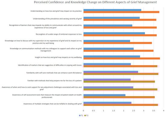 Level 2 Learning: At baseline, the total score on confidence and knowledge as measured by the 13 statements was 35.30 (±12.01) on average, ranging from 13 to 52. Post-course, the total mean score increased to 41.06 (±16.60) and the increase was statistically significant (t(188) = 4.02, p < 0.05). The average score for individual statement was 2.71 (±1.08). This average score represents a knowledge level just above “Not very knowledgeable (2)” but below “Somewhat knowledgeable (3)”. The average score for individual statement increased to 3.64 (±0.50) post-course, representing a knowledge level approaching “very knowledgeable (4)”. Paired t-test analysis indicated statistically significant improvement in all 13 items (See Figure 1). A change from pre- to post-intervention on the single item (0 to 10) (VAS) assessing participant confidence in being able to recognize and manage grief and loss was also significant. Participants reported an average score of 6.9 (±1.6) at baseline, which increased to 9.2 (±1.0) post-program (t = 16.21, p < 0.01).