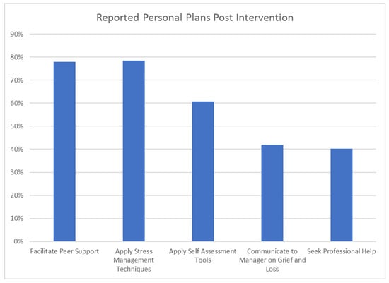 Level 3 Behaviors: Personal Plans: Participants posted and discussed personal plans in the final sessions of the course. They were also asked to rate their intention to carry out specific behavioral changes, including (i) apply self-assessment tools to identify loss and grief; (ii) facilitate discussions with colleagues on issues of grief management and form a peer group to obtain support for each other; (iii) communicate to supervisor about personal experiences with grief and loss; (iv) apply various stress management techniques to reduce distress and enhance coping and wellness; and (v) seek support from a mental health professional when having difficulties in managing grief.