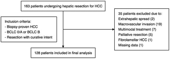 We retrospectively analysed the clinical and laboratory data of patients who underwent hepatic resection for HCC at the University Hospital Frankfurt, a German referral centre for liver diseases (February 2007–May 2019). Patients were included in the study if they had biopsy-proven HCC (BCLC stage 0/A or B) and if they were operated on with curative intent (Figure 1). Surgery was recommended by a multidisciplinary tumour board at the University Hospital Frankfurt. Patients were excluded if they had advanced (BCLC C) disease with macrovascular invasion or extrahepatic spread, if they were operated on with palliative intent, or if histology revealed an alternative diagnosis such as intrahepatic cholangiocarcinoma or fibrolamellar HCC (Figure 1). The study was approved by the institutional review board of the University Hospital Frankfurt (reference number SGI-4-2019).