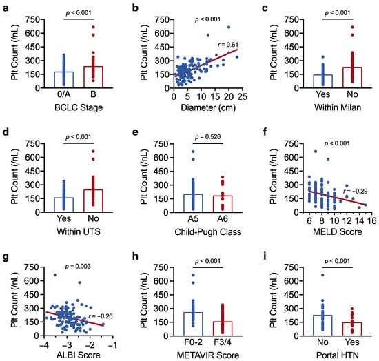 Platelet count correlates with tumour burden and liver disease severity in resectable HCC. (a–i) Results of a linear regression analysis showing the association of platelet count with (a) BCLC stage, (b) maximum tumour diameter, (c) the Milan criteria, (d) the Up-to-Seven (UTS) criteria, (e) Child–Pugh class, (f) MELD score, (g) ALBI score, (h) METAVIR fibrosis score, and (i) portal hypertension (HTN). Correlation coefficients (r) were determined by Pearson’s correlation analysis. The analysis was carried out in the full cohort of 128 patients in (a–h) and was limited to the 70 patients who underwent upper gastrointestinal endoscopy in (i). Results with a p-value < 0.05 were considered statistically significant.