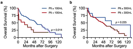 Figure A1: Schematic detailing the postoperative outcomes of the 128 patients included in the study; Table A1: Overall survival analysed by multiple Cox regression (plt count: binary variable); Table A2: Overall survival analysed by multiple Cox regression (plt count: continuous variable).