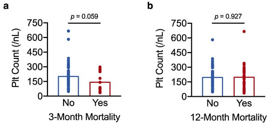 To further investigate why low platelet count associated with unfavourable survival outcomes, we then asked whether low platelet count also correlated with perioperative mortality. The question was addressed by logistic regression analysis with platelet count as the predictor variable and perioperative mortality as the outcome variable. Perioperative mortality was defined as mortality within 3 months after surgery [31]. In univariate analysis, low platelet count associated with increased perioperative mortality, such that for every 50/nL decrease in platelet count, the odds of death vs. survival at 3 months increased by more than 50% (odds ratio (OR) 1.55 for death vs. survival at 3 months, 95% CI 1.06–2.40, p = 0.034). Accordingly, platelet counts were lower in the 13 patients who died perioperatively (148 ± 27/nL) compared with the rest of the cohort (206 ± 9/nL) (Figure 4a). Low platelet count remained a predictor of perioperative death after adjusting the regression model for BCLC stage and maximum tumour diameter (OR 1.96 per 50/nL decrease in platelet count, 95% CI 1.19–3.53, p = 0.014). By contrast, platelet count no longer affected the odds of death vs. survival at 12 months post resection (p = 0.917), and platelet counts did not differ between patients who died within 12 months of surgery (202 ± 21/nL) and the rest of the cohort (200 ± 10/nL) (Figure 4b).