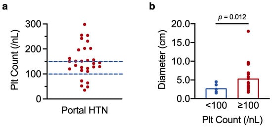 Given the observed link between low platelet count and perioperative mortality, we finally asked whether preoperative platelet count could be used to identify patients with portal hypertension (an established measure of increased surgical risk [22]) who may be better served by locoregional therapies. HCC practice guidelines recommend a platelet cut-off score of 100/nL to rule in (<100/nL) or rule out (≥100/nL) the possibility of portal hypertension [5,6]. We therefore tested whether this cut-off score reliably discriminates between HCC patients with and without portal hypertension. Of the 70 patients for whom endoscopy data were available, oesophageal varices and/or portal hypertensive gastropathy were recorded in 29 patients. Among the 29 patients with manifest portal hypertension, only 5 had platelet counts below 100/nL, and almost half had platelet counts in the normal range (≥150/nL) (Figure 5a). In line with our results in Section 3.1., the 5 patients with portal hypertension and very low platelet counts had smaller tumours than the 24 patients with portal hypertension and higher platelet numbers (mean tumour size 2.8 ± 0.6 cm in patients with platelet counts <100/nL, vs. 5.4 ± 0.8 cm in patients with platelet counts ≥100/nL, p = 0.012 as determined by t-test analysis) (Figure 5b). Thus, platelet counts in the normal range do not exclude portal hypertension in patients with resectable HCC, particularly in individuals with greater tumour burden (which may be accompanied by a paraneoplastic increase in platelet count).