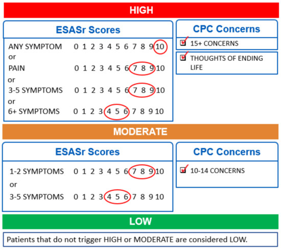 The ESAS-r and CPC results were used to determine a symptom complexity score for each PROs questionnaire, based on an original validated algorithm created within CCA [19]. The algorithm considers the unique combination of symptoms and concerns a patient has identified on a single questionnaire and assigns a symptom complexity score (low/green, moderate/yellow or high/red) for each encounter. The criteria triggering each complexity level are shown in Figure 1. Only one criterion in a level needs to be met to trigger that level’s complexity score.