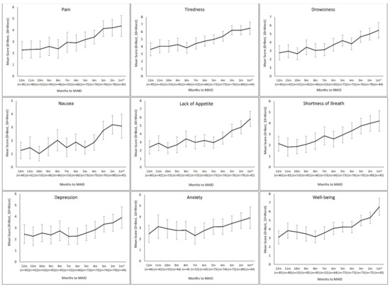 Descriptive statistics (mean, standard deviation, interquartile range, and frequency) were used to examine patient characteristics, symptom prevalence and symptom complexity. Chi-squared tests (for categorical variables) and independent t tests (for continuous variables) were used to test for differences between the subgroups with and without PROs. ESAS-r symptom scores were arranged based on the month the questionnaire was completed prior to the MAID provision date. Each month was coded in decreasing order from 12 to 1, with 12 indicating questionnaires completed 12 months prior to MAID provision and 1 indicating questionnaires completed within the same month as MAID provision. All questionnaires were included unless a patient had multiple within the same month, in which case the questionnaire with higher symptom scores was selected, in keeping with the approach followed in studies with similar methods [26]. To estimate longitudinal changes of ESAS-r scores in the 12 months prior to MAID, the primary analysis used a mixed effects model (MEM) for repeated measures [27]. The MEM allows for the timing and number of assessments to differ across patients and for the inclusion of time-varying covariates, and appropriately adjusts variance estimates for the correlation of repeated observations from the same patient [28]. With this type of real-world data involving morbidity and/or mortality, there will always be concerns about missing data [27,29]. However, in keeping with previous studies using a similar method, we assumed that data were missing at random, and therefore all available data were included [29].