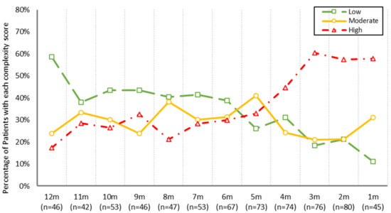 The 193 patients with PROs data completed 922 questionnaires in total. Of these, 336 questionnaires (36.4%) were classified as low complexity, 262 (28.4%) as moderate complexity, and 324 (35.1%) as high complexity. Results of the GEE showed that symptom complexity levels increased significantly over time (OR = 1.20 (95% CI: 1.14–1.23), SE = 0.028, Wald χ2 = 42.0, p < 0.01), as patients approached their MAID provision dates. Figure 3 depicts the distribution of symptom complexity levels by month prior to MAID. Less than 20% of patients had high complexity at 12 months prior to MAID and about 60% of patients had low complexity. There is a noticeable change just one month later, at month 11, as the share of low complexity patients drops below 40%, while moderate and high complexity increase. Another noticeable change takes place after month 5, with the share of moderate and low complexity patients decreasing and high complexity patients sharply increasing. During the last month of life, nearly 60% of patients experienced high symptom complexity, while only 10% experienced low complexity.