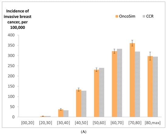 (A) Incidence of invasive breast cancer (per 100,000 women) by age group in 1992–2013, OncoSim-Breast vs. Canadian Cancer Registry (CCR); (B) incidence of ductal carcinoma in situ (per 100,000 women) by age group in 1992–2013, OncoSim-Breast vs. Canadian Cancer Registry (CCR). Error bars represent the 95% confidence intervals.