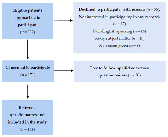 A total of 227 eligible patients were approached, to which 171 consented to participate and 56 declined for various reasons (Figure 1). Twenty patients did not return the questionnaires and were considered lost to follow-up. A total of 151 patients returned the questionnaires and comprised the study sample (88.3% response rate).