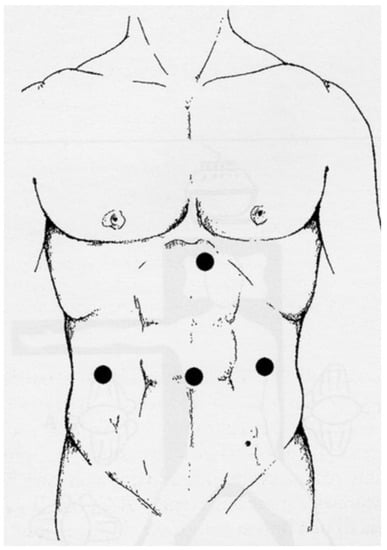 In the laparoscopic procedure, a carbon dioxide (CO2) pneumoperitoneum of ~12 mm Hg was created by insufflation via the open supra-umbilical Hasson technique or Veress needle inserted at Palmer’s point, with the patient placed in the supine split leg, reverse Trendelenburg position, with the operating surgeon between the patient’s legs, a camera assistant and the assistant surgeon on the left side. After establishment of pneumoperitoneum and introduction of the camera port, the working ports and assistance ports were introduced under laparoscopic vision. The type and placement of trocars, number of ports, and location of the mini-laparotomy incision for extracting the resected specimen were discretionary, depending on patients’ clinical characteristics (abdominal conformation, BMI, tumour size, tumour location, etc.) and according to the surgeons’ preference. Commonly, four 12 mm laparoscopic trocars were inserted as displayed in Figure 2: one supra-umbilical trocar for the (30° forward-oblique) laparoscope, one trocar in the left mid clavicular line at the intersection with the transverse umbilical line and one at the contralateral site, and one trocar in the epigastrium at the right paramedian line 2 cm below the costal margin.