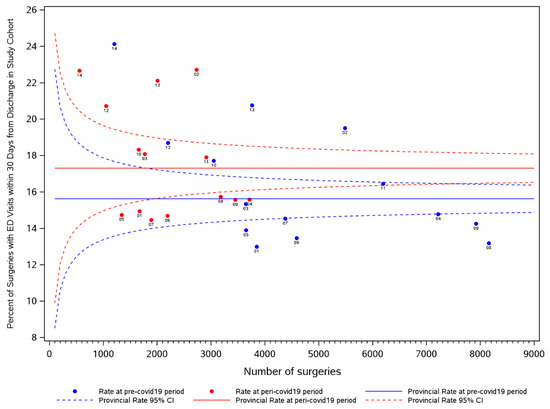 Funnel plot illustrating variation in ED rates following cancer-directed surgeries in the pre- and peri-periods, across LHINs. Legend: Each LHIN is represented by a dot in the funnel plot, where the x-coordinate provides the number of cancer-directed surgeries occurring in the LHIN and the y-coordinate provides the corresponding percentage that ends up in ED within 30 days following discharge. The horizontal line illustrates the average ED rate, overall, and it is surrounded by the corresponding 95% confidence limits. These limits represent the expected bound around the average proportion for varying population sizes [14].