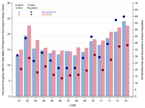 Histogram illustrating ED rates within our cohort of cancer-directed surgeries compared with ED rates in the general provincial population during the pre- and peri-periods, across LHINs. Legend: The y-axis on the left-hand side and corresponding bars reflects the ED rates in our surgical cohort, while the y-axis on the right-hand side and corresponding overlaid points provide the ED rates in the entire province.