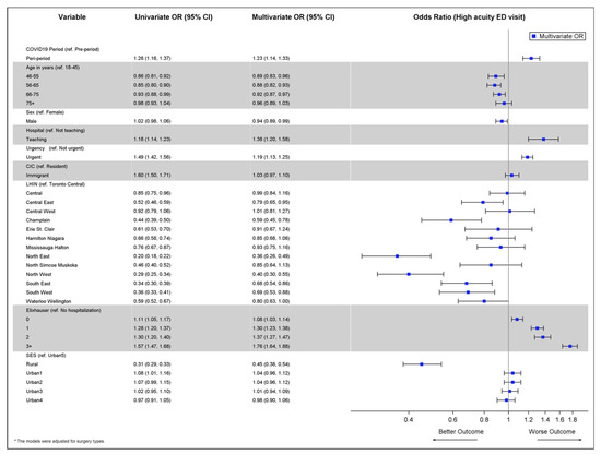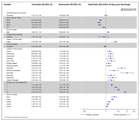 The primary exposure was the period during which the cancer-directed surgery occurred: pre-pandemic (on or prior to 14 March 2020) vs. pandemic (on or after March 15, 2020; ramp down initiation for elective surgery). The primary outcome was the odds of experiencing an ED visit within 30 days following discharge from surgery. Characteristics measured at the time of cancer-directed surgery included: patient factors—age, sex, rurality, neighborhood income quintile, region of residence based on Local Health Integrated Networks (LHINs; 14 geographic regions in Ontario), immigration status (immigrant vs. not), marginalization quintiles, Elixhauser comorbidity level (no hospitalization, 0, 1, 2, 3+) based on a 5 year look back window prior to the time of surgery [12,13]; surgical factors—type of cancer-directed surgery, urgency of surgery (urgent—either arrived to hospital via ambulance or were admitted through the emergency department vs. not); and hospital factors—type of corresponding hospital (teaching vs. not).