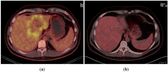 (a) Tumor in FDG-PET-CT scan at the time of initial presentation. (b) Tumor in FDG-PET-CT scan after chemotherapy and bilobar SIRT.