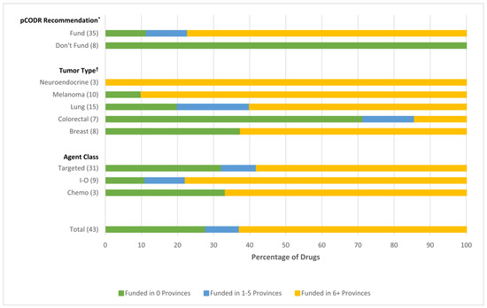 Tumor type predicted the decision to fund, with funding in at least one province for 100% of NET drugs, 90% of melanoma drugs, 80% of lung cancer drugs, 63% of breast cancer drugs, and 29% of CRC drugs (p = 0.005) (Figure 2).