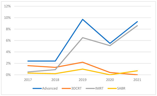 The use of advanced RT techniques increased significantly from 2017 to 2021, averaging 5% over the study duration (Figure 1). Most advanced RT techniques were 3DCRT (26%) or IMRT (67%), with only 8% of advanced cases representing SABR. Because of the small SABR and 3DCRT numbers, we performed analyses separately and with all three advanced techniques combined.