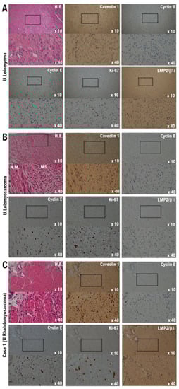 Differential expression of cyclin B, cyclin E, caveolin-1, ki-67, and LMP2/b1i as potential biomarkers in the normal myometrium, uterine leiomyoma, uterine leiomyosarcoma, and the Case 1 uterine tumor. (A) The image shows spindle cell leiomyoma. Low-power view (10× field) shows a well-circumscribed tumor nodule in the myometrium composed of broad fascicles of spindle cells. A high-power view (40× field) shows uterine leiomyoma (spindle cell) with bland cytological features, elongated nuclei, and fine nuclear chromatin. Immunohistochemistry of uterine leiomyoma tissue sections was performed using monoclonal antibodies. (B) The image shows uterine epithelioid leiomyosarcoma. Low power view (10× field) shows a uterine mass and an irregular interface with the myometrium composed of round to polygonal cells with granular eosinophilic cytoplasm. The presence of significant nuclear atypia and mitoses is evident. High-power view (40× field) shows tumor cells that are round to ovoid. The tumor cells have eosinophilic granular cytoplasm and irregular-shaped nuclei. Immunohistochemistry of the leiomyosarcoma tissue sections was performed using the appropriate monoclonal antibodies. (C) Case 1 uterine tumor appears as an admixture of round, polygonal, bizarre, or spindle cells, with marked atypia, with or without giant cells and rhabdomyoblasts. Some tumors invaded the lymphatic vessels. Low-power view (10× field) shows no obvious high-grade nuclear atypia or mitotic cell proliferation, and necrosis is observed. The high-power view (40× field) showing tumor cells with significant pleomorphism, whereas some are multinucleated and rhabdomyoblastic differentiation is evident. Immunohistochemistry with the of normal myometrium, leiomyoma, leiomyosarcoma, and the Case 1 uterine tumor was performed using appropriate monoclonal antibodies.
