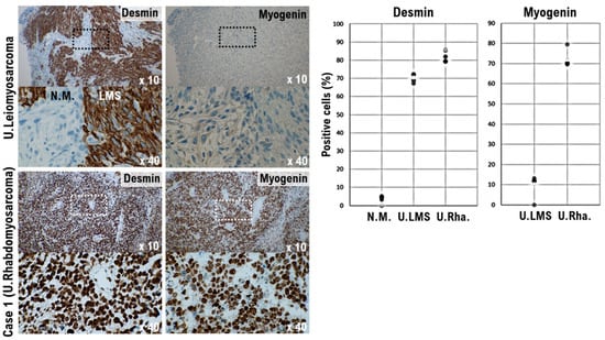 Significance of myogenin-positive uterine mesenchymal tumor cells in the Case 1 tumor. Differential expression of desmin and myogenin as potential biomarkers in normal myometrium, uterine leiomyosarcoma, and the Case 1 uterine tumor. The photograph shows uterine epithelioid leiomyosarcoma and normal myometrium. The low power view (10× field) shows the uterine mass irregular interface with normal myometrium, which is composed of round to polygonal cells with granular eosinophilic cytoplasm. The presence of significant nuclear atypia and mitoses is evident. A high-power view (40× field) shows tumor cells that are round to ovoid. The tumor cells have eosinophilic granular cytoplasm and irregular shaped nuclei. Immunohistochemistry (IHC) with the tissue sections of leiomyosarcoma was performed using the appropriate monoclonal antibodies (left upper panel). Case 1 uterine tumor is an admixture of round, polygonal, bizarre, or spindle cells, with marked atypia, with or without giant cells and rhabdomyoblasts. Some tumors invaded the lymphatic vessels. The low-power view (10× field) shows no obvious high grade nuclear atypia or mitotic cell proliferation. The high-power view (40× field) shows that tumor cells exhibit significant pleomorphism and some show multi-nucleated, rhabdomyoblastic differentiation. IHC with the Case 1 uterine tumor was performed using the appropriate monoclonal antibodies (left lower panel). The five tissue sites were randomly selected from normal myometrium, uterine leiomyosarcoma, and the Case 1 uterine tumor. In a 40× field of view, the positive rates for the two biomarkers were determined in three tissue sites under a microscope (Panthera Shimadzu Co. Ltd., Kyoto, Japan) (right panel). The positive rates at the sites for each tissue are shown in a scatter plot.