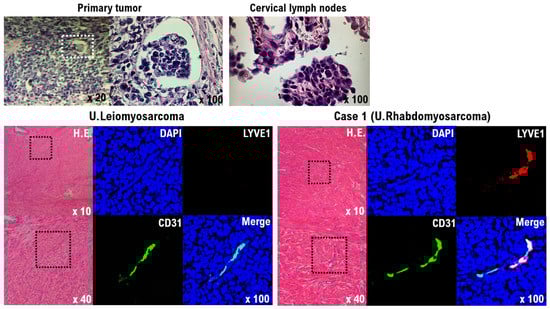 Circular cells with a high nuclear cytoplasm ratio (N/C) were found in the biopsy of the tumors of the left supraclavicular lymph node, as well as cells infiltrating the lymph vessels within the patient’s uterine tumor (Figure 4). In addition, intravascular infiltration by the uterine tumor cells was observed (Figure 4). Based on this observation, we determined that the tumor of the left supraclavicular lymph node was not a malignant lymphoma, but a lymph node metastasis derived from a malignant mesenchymal tumor originating in the uterus. Lymphatic endothelial cells (CD31 and LYVE1-positive cells), which were not found in the uterine leiomyosarcoma, were observed in the uterine tumor (Figure 4). Although lymphatic metastases are rarely found in uterine leiomyosarcoma, in pleomorphic rhabdomyosarcoma, distant metastases to other organs and lymph node metastases are common [25].