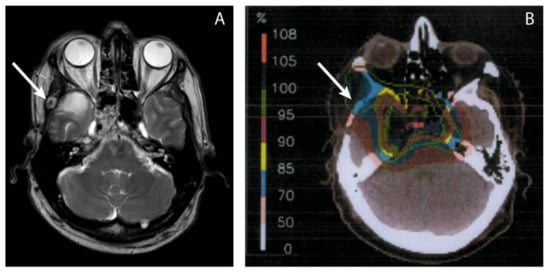 26. Viselner, G.; Farina, L.; Lucev, F.; Turpini, E.; Lungarotti, L.; Bacila, A.; Iannalfi, A.; D’Ippolito, E.; Vischioni, B.; Ronchi, S.; et al. Brain MR findings in patients treated with particle therapy for skull base tumors. Insights Imaging 2019, 10, 1–15. [Google Scholar] [CrossRef] [Green Version]