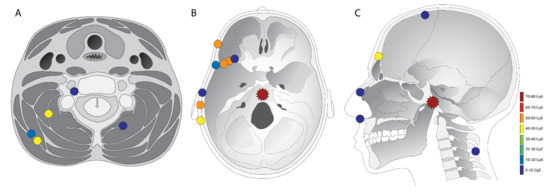 Figure 2. Overview of all defined chordoma lesions. The primary tumor is marked with a star, and ectopic recurrences with a dot. The colour of the markings are an estimation of the dose in GyRBE that was delivered at the site where later the recurrence was visible. All lesions are only marked once in either (A,B) or (C). The location in the figure is an approximation of the actual recurrence location, so as to fit all the lesions in these three illustrations. However, the compartment of the lesion (subcutaneous, fibrous tissue/muscle, or bone) is accurate.