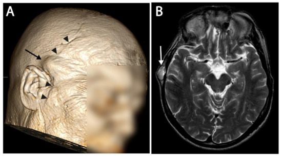 Figure 3. (A) 3D reconstructed image of an MRI. A subcutaneous recurrence is visible as a bump under the skin, and is indicated with an arrow. The surgical scar from the coronal midfacial approach is also visible and marked with arrowheads. (B) T2 image of the same patient at the level of recurrence. Subcutaneous recurrence is marked with an arrow.