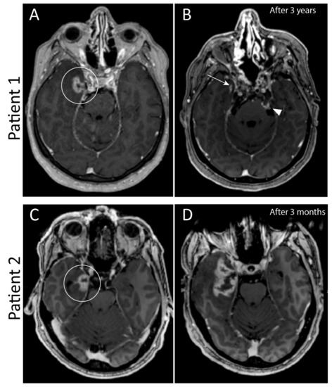 Figure 4. Two patients with similar contrast enhancement of the medial temporal lobe three years after radiotherapy in patient 1, and one year after radiotherapy in patient 2 (circled in (A,C)). This contrast enhancement is consistent with either radiation necrosis or tumor progression. In (A) there are also hyperintense foci in the upper cerebellum, which are due to phase encoded pulsation artefacts of the carotid artery on both sides and not a true enhancement. Follow-up imaging after three months showed no differences in patient 1, and imaging after 3 years (B) showed clear regression of enhancement of the temporal lobe (arrow). However, this patient had tumor progression in the clivus and cerebellopontine cistern on the left side (arrowhead). In patient 2, follow-up imaging after three months (D) showed clear progression in enhancement and mass effect. Tissue biopsy confirmed that this was tumor progression.