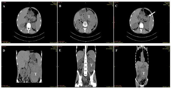Pathological findings. (A) This image shows a normal transverse CT scan. (B) This transverse CT scan shows a large mass lesion with low-density cystic lesions (T), arising from the left kidney. (C) This transverse CT scan shows an aberrant extension of the left kidney (white arrow). (D–F) Coronal CT scans show that the RCC originated from the left kidney and they also provide information regarding tumor size.