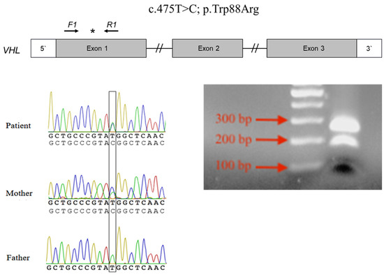 The VHL coding sequence is represented in three exons (Figure 2). The heterozygous missense mutation (NM_000551.4: c.262T > C) in exon 1 of the VHL gene was identified in the patient and his mother by whole-exome sequencing. Sanger sequencing confirmed that the patient and his mother were carrying this mutation in a heterozygous form (Figure 2). His father was devoid of this mutation. This mutation was further detected using the PCR-RFLP method. Digestion of the 266-bp amplicon resulted in either retention of the 266-bp product or complete digestion to 187-bp and 79-bp fragments (Figure 2).