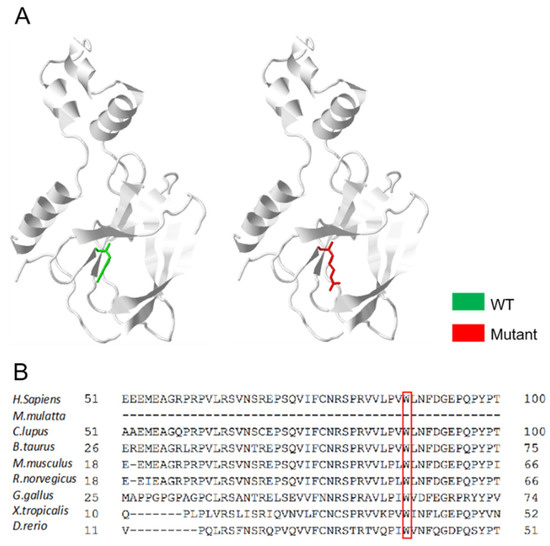 The missense mutation (NM_000551.4: c.262T > C) was not identified in the genome aggregation database (gnomAD v2.1.1, https://gnomad.broadinstitute.org/ 15 November 2021). However, it is present in the dbSNP database (dbSNP: rs1553619431), UniProtKB database (code VAR_005697) and ClinVar database (https://www.ncbi.nlm.nih.gov/clinvar/ 15 November 2021), without its distribution frequency. This missense mutation leads to the replacement of tryptophan with arginine at the 88th position (p.Try88Arg) in the VHL-encoded protein and VHL tumor suppressor protein (pVHL). The predicted 3D structures of proteins provide reliable insights into whether missense variants are associated with disease, while it is also important to assess the reliability of using predicted models when analyzing missense variants [18]. Interestingly, no structural change in pVHL was predicted for p.Trp88Arg using Missense3D (http://www.sbg.bio.ic.ac.uk/missense3d/ 11 November 2021) (Figure 3A). Therefore, another in silico analysis was performed to understand and predict the significance of this mutation. Online mutation prediction software, PolyPhen-2 and I-Mutant 2.0, predicted this mutation as “PROBABLY DAMAGING” and “Deleterious”, respectively. In the multiple sequence alignment, the VHL p.Trp88Arg is evolutionarily highly conserved among different species (Figure 3B). Hence, we predict that the mutation of this residue may exert a dominant negative effect on pVHL.