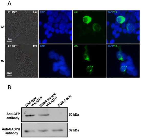 VHL mutation (p.Try88Arg) changes the intracellular localization and protein level. (A). Confocal microscopy shows the intracellular localization of GFP-pVHL (WT) and GFP-pVHL (p.Try88Arg) in HEK293 cells. The targeted plasmids were transfected into HEK293 for 24 h, and the cells were counterstained with DAPI. The cells were then washed three times and used for imaging. GFP-pVHL (green); DAPI (blue). (B). Western blot analysis showed a reduced VHL protein level in HEK293 cells transfected with the VHL mutant expression vector.