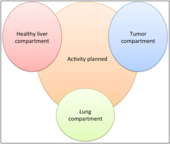 SIRT is planned in two phases. First, a simulation is always performed to evaluate the feasibility of the treatment. An interventional radiologist catheterizes the liver artery(ies) and evaluates the arterial feeding of the tumor(s). A non-therapeutic nuclear medicine agent, technetium-99m macro-aggregated albumin (MAA), is injected into the liver artery(ies) supplying the tumor(s) for simulating the distribution of the radioactive microspheres. Thereafter, the MAA distribution is assessed by nuclear imaging using single-photon emission computed tomography combined with computed tomography (MAA SPECT/CT). This imaging confirms the accurate targeting of the tumor(s) and the absence of risk of toxicity (digestive or lung irradiation). Then, the phase of treatment is scheduled with injection of the radioactive microspheres in the same technical conditions. The recommended methods for calculating the amount of radioactive microspheres needed for the treatment (activity) differ between the different available microspheres [6,7,8]. These methods are semi-empirical, based on the body surface area for resin microspheres, and using a mono-compartmental model (based on the liver volume) for glass and holmium-166-poly-L-lactic acid microspheres [9]. During the workup, the MAA distribution in the tumor, the healthy liver, and the lung compartments can also be evaluated to perform a more personalized method of activity planning (multi-compartmental or partition model) [1].