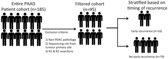 RNA sequencing data and accompanying clinical data were obtained from the online TCGA data archive for PDAC. A total of 185 patients are included within this dataset. However, a highly heterogeneous patient population was noted, and as such, patients with non-PDAC pathology (neuroendocrine tumours or rare subtypes of PDAC) and patients who had sequencing performed from non-primary tumour sites (e.g., biopsied liver metastases or peritoneal disease) were excluded in order to create a uniform patient cohort. Patients with an R1 or R2 resection margin status were also excluded from the analysis. The presence of a positive margin could impact the interpretation of local recurrence rates. Excluding the patients with a positive margin created a smaller but homogenous patient cohort, all of whom had undergone a curative resection. This resulted in a final cohort of 95 patients (