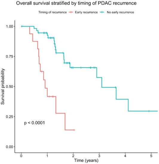 Firstly, in order to determine whether early disease recurrence has a clinically meaningful impact on patient survival, a survival analysis was performed on the cohort. Early disease recurrence was associated with a significantly worse overall survival (